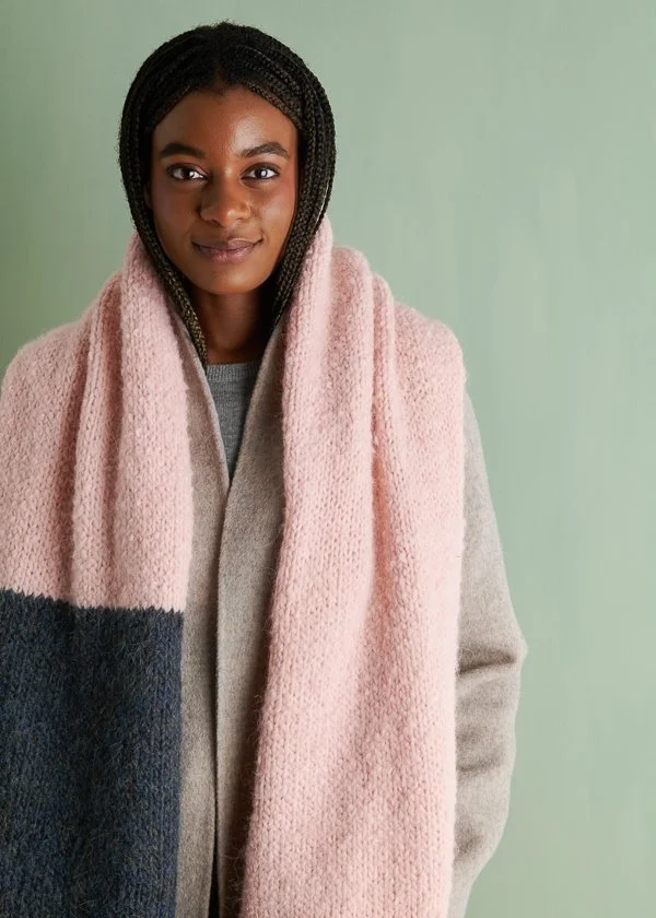 Make a rectangular scarf - but make it fun. The colourblocking options are endless with Purl Soho’s Featherdown Wrap and the super bulky yarn means quick progress. The pattern is free and comes one size. Choose your favorite colours and just get going!