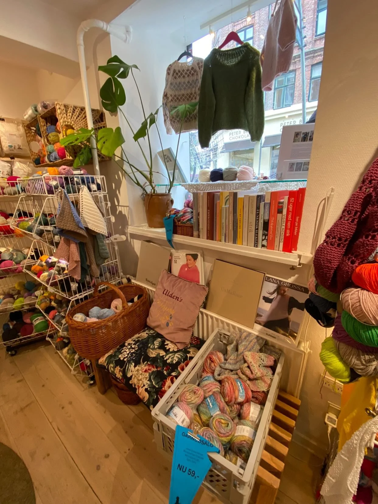 In Østerbro, one of Copenhagen’s most charming neighbourhoods, I walk down three small steps into a souterrain shop just off Nordre Frihavnsgade. Warm light spills across shelves lined with yarn, and behind the counter on the left is the shop’s owner, Lone. She is knitting and greets me with a friendly smile, ready to help in both Danish and English.